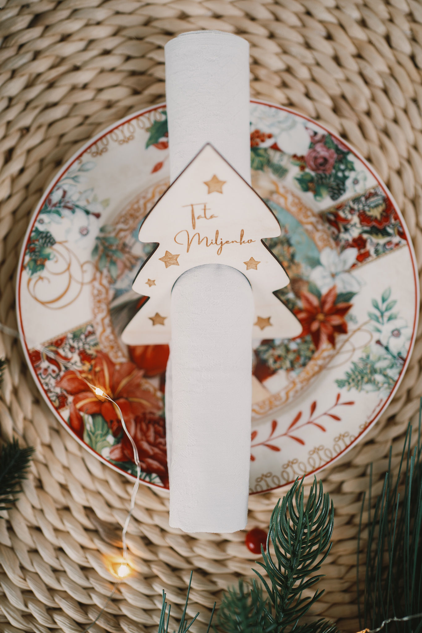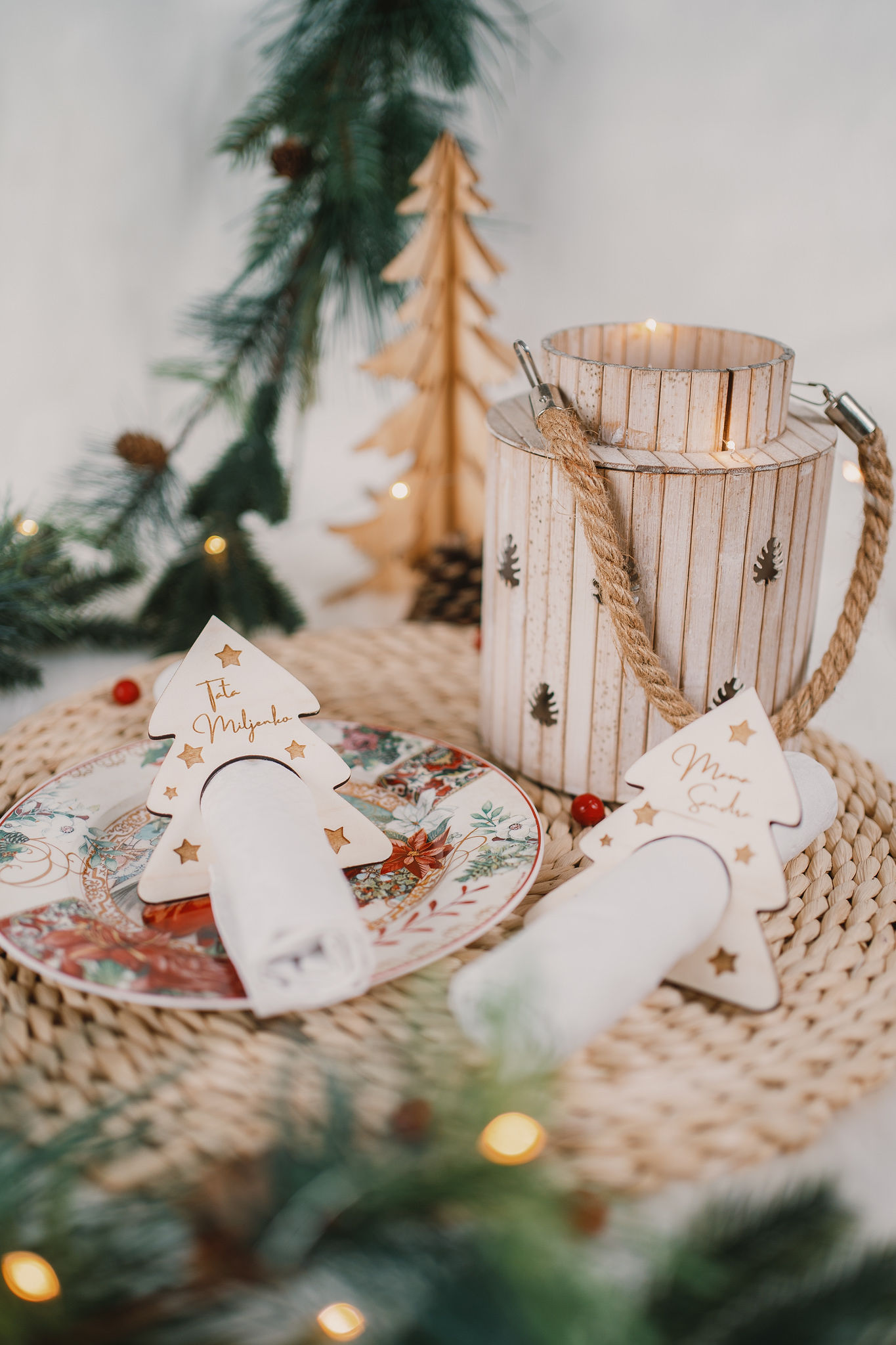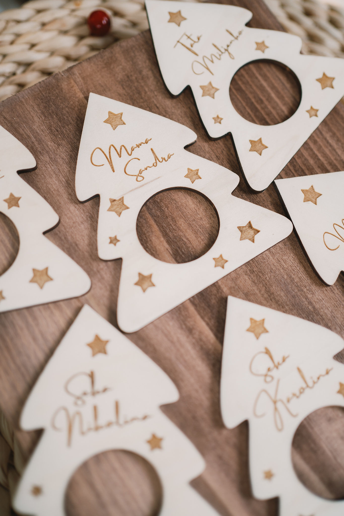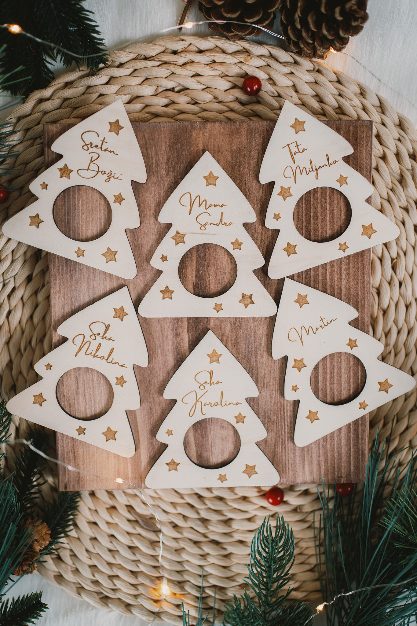 Set ukrasa za salvete sadrži 6 komada drvenih ukrasa u obliku bora na koje sami upisujete imena ili tekst od najviše 2 riječi.